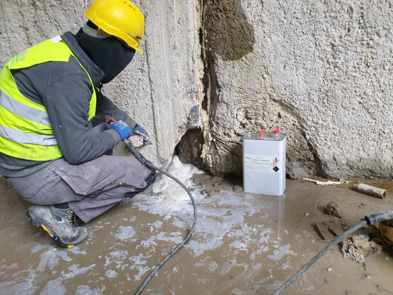 • Uszczelnianie Aktywnych Przecieków Konstrukcji: Trwale eliminujemy infiltrację wody w elementach betonowych (fundamenty, tunele, szyby, zbiorniki, dylatacje konstrukcji oraz przejścia instalacyjne) za pomocą szybkowiążących żywic poliuretanowych i akrylowych poprzez iniekcję wysokociśnieniową